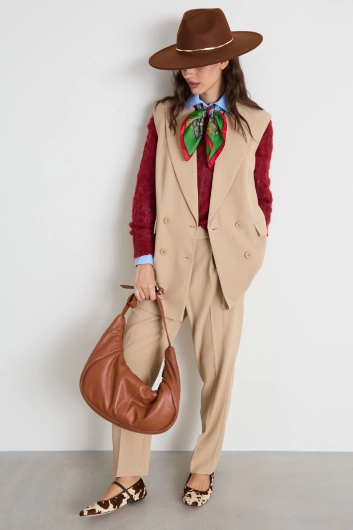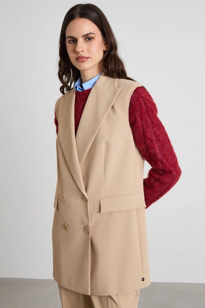 Straight-fit gilet in flowing twill, with peak lapel collar, sleeveless, double-welt side pockets with flap and central vent on the back. Double-breasted fastening with buttons. Lined.