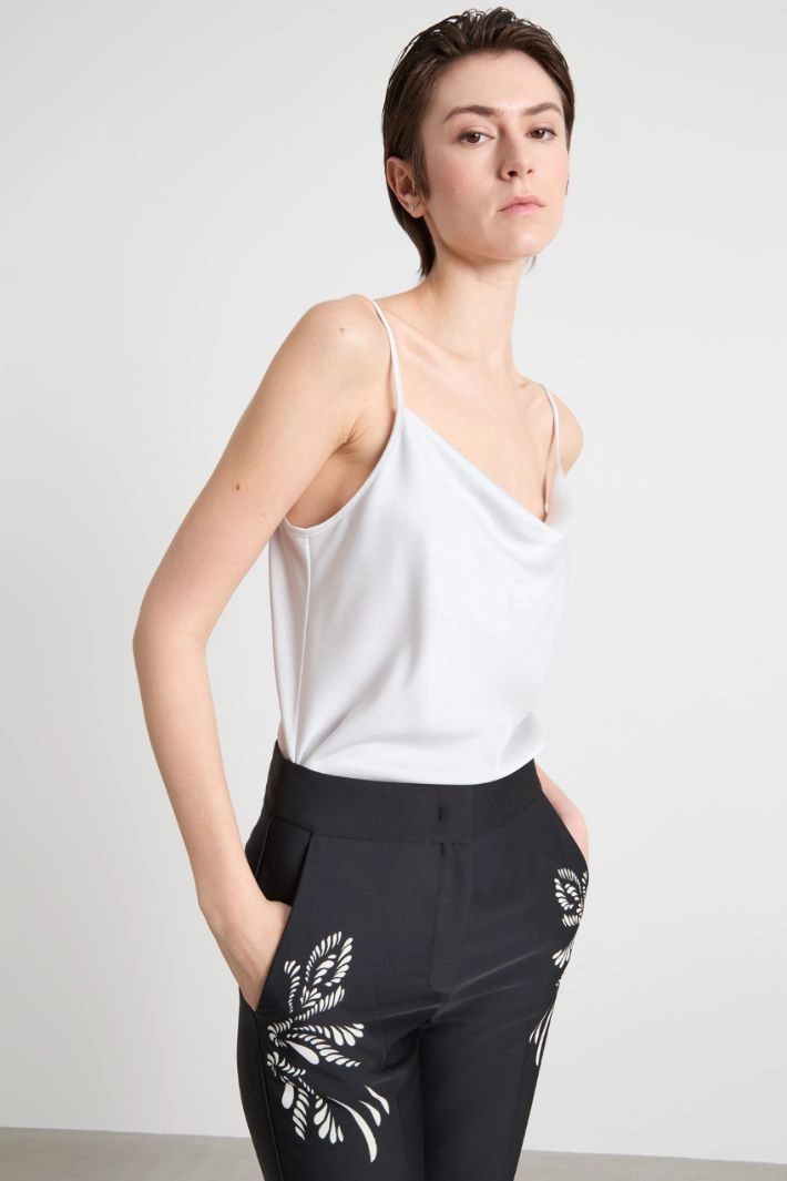 Satin slip top with a flowing silhouette, featuring a cowl neck and delicate spaghetti straps.