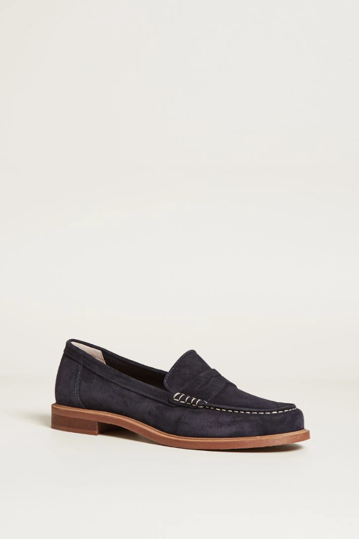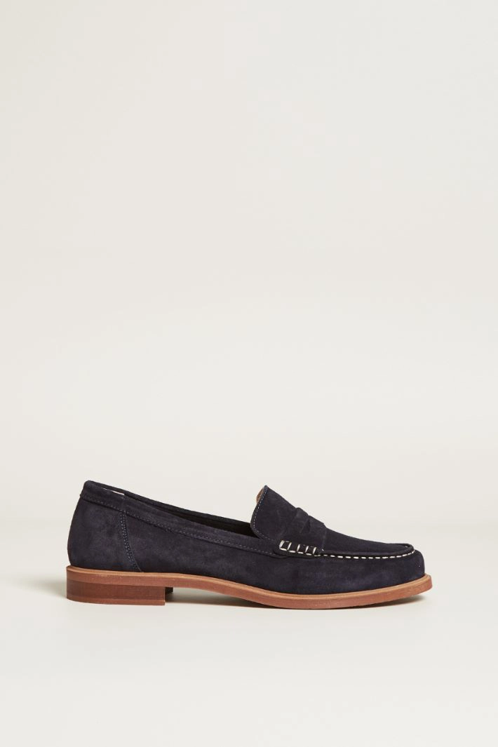Suede leather moccasins with stitching on the upper and band detail on the front. Rubber sole.