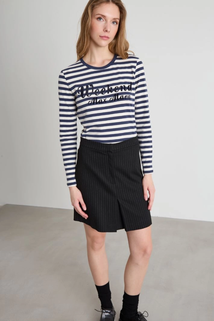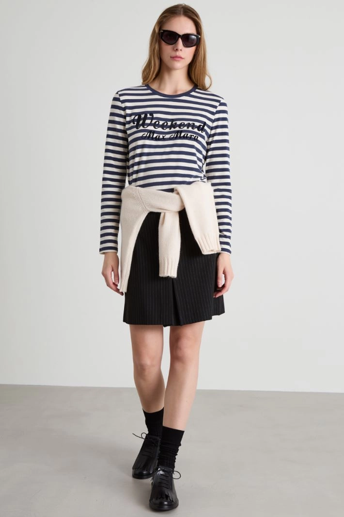 Straight-cut T-shirt in yarn-dyed stretch cotton jersey, with print motif on the front, crew neck and long sleeves.