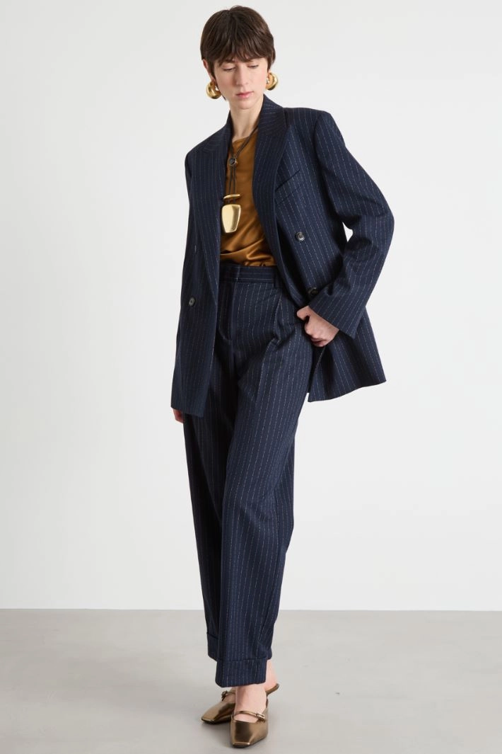 Wide-leg trousers crafted in pinstripe flannel, featuring belt loops and pleats at the waist, front French pockets and rear welt pockets. Fastening with a button and a concealed zip.