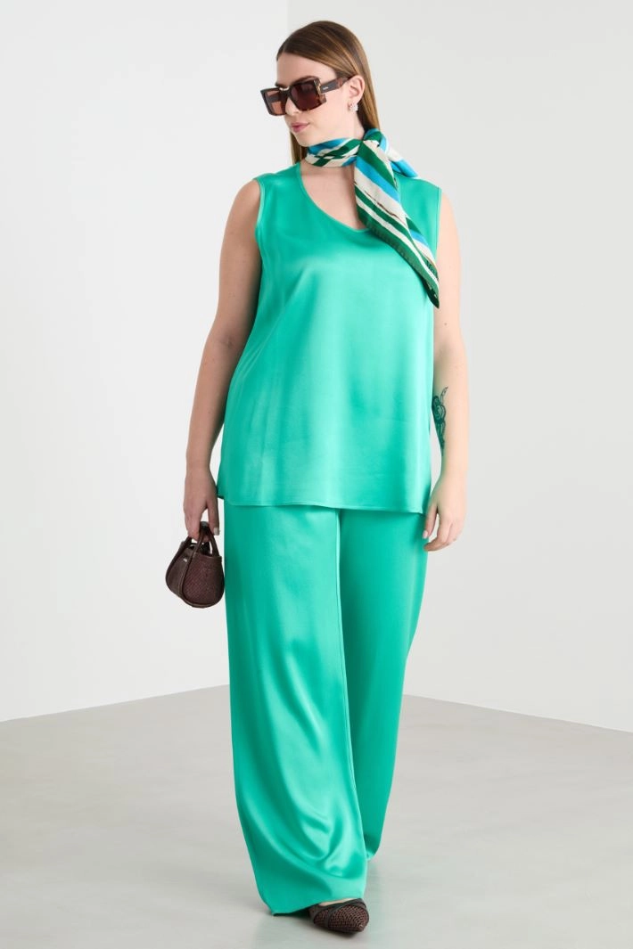 Straight-fit trousers in lustrous fabric, with an elasticated insert at the waist.