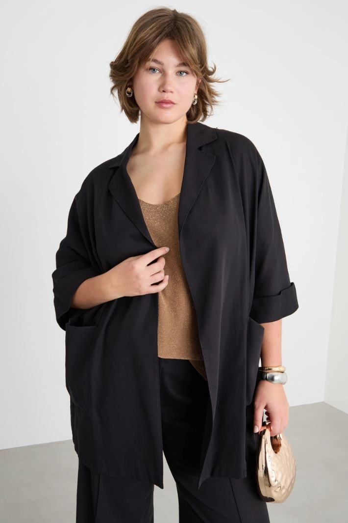 Loose-fit tunic crafted in pure cotton crepe, featuring a wide lapel collar, long kimono sleeves with turn-up cuffs and patch pockets. Press-stud fastening.